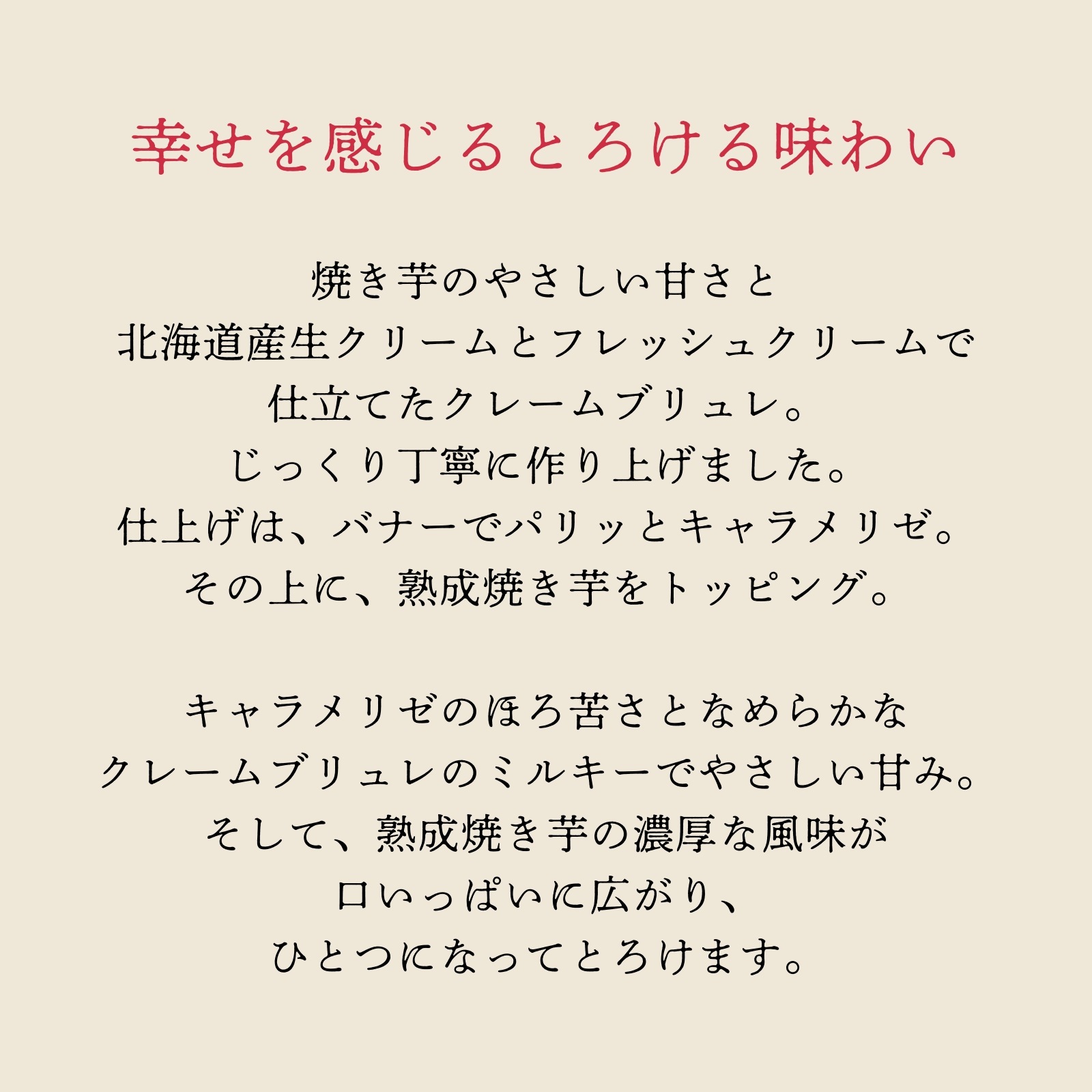 | 名称 | 【芋カフェ夜の贅沢】 熟成焼き芋を使ったトロ~っとひんやり蜜芋の生クレームブリュレ |
